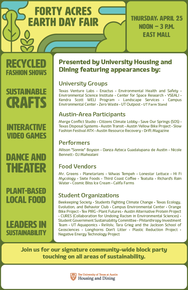 I deigned the logo and branding for University Housing and Dining's Forty Acres Earth Day Fair, an educational and fun event which highlights the university's sustainability efforts. Working with the client's vision, I used color and a clean illustration style to create an engaging and environmentally focused campaign.